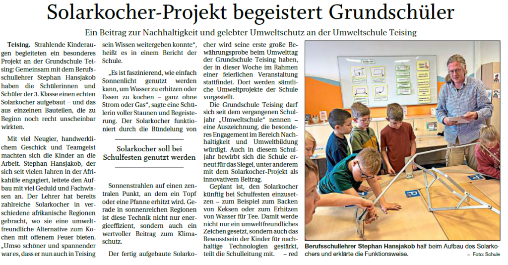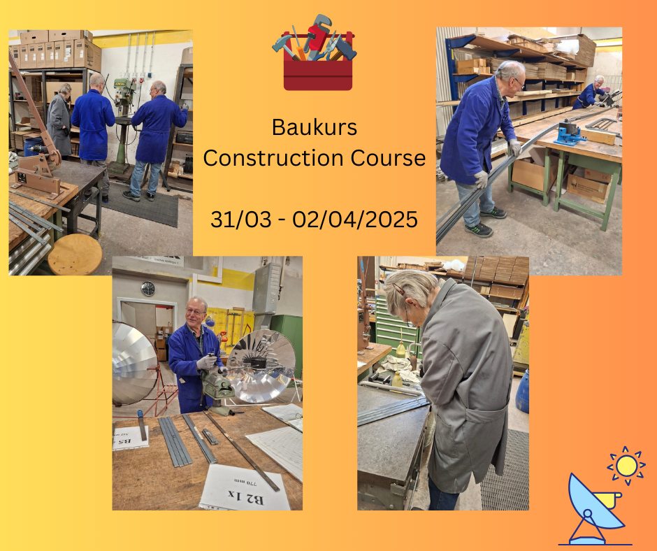 Anfang Mai hielt sich unser Vorstandsvorsitzender, Hans Michlbauer, an 3 Nachmittagen zu einem Solarkocherbaukurs an der Schule auf. Insgesamt 10 Lehrerinnen und Lehrer nutzten die Zeit nach Unterrichtsschluss um alles über die Fertigung der Bauteile, der Montage und der Handhabung unseres 𝗣𝗮𝗿𝗮𝗯𝗼𝗹𝘀𝗼𝗹𝗮𝗿𝗸𝗼𝗰𝗵𝗲𝗿𝘀 𝗦𝗞𝟭𝟰 zu erfahren.